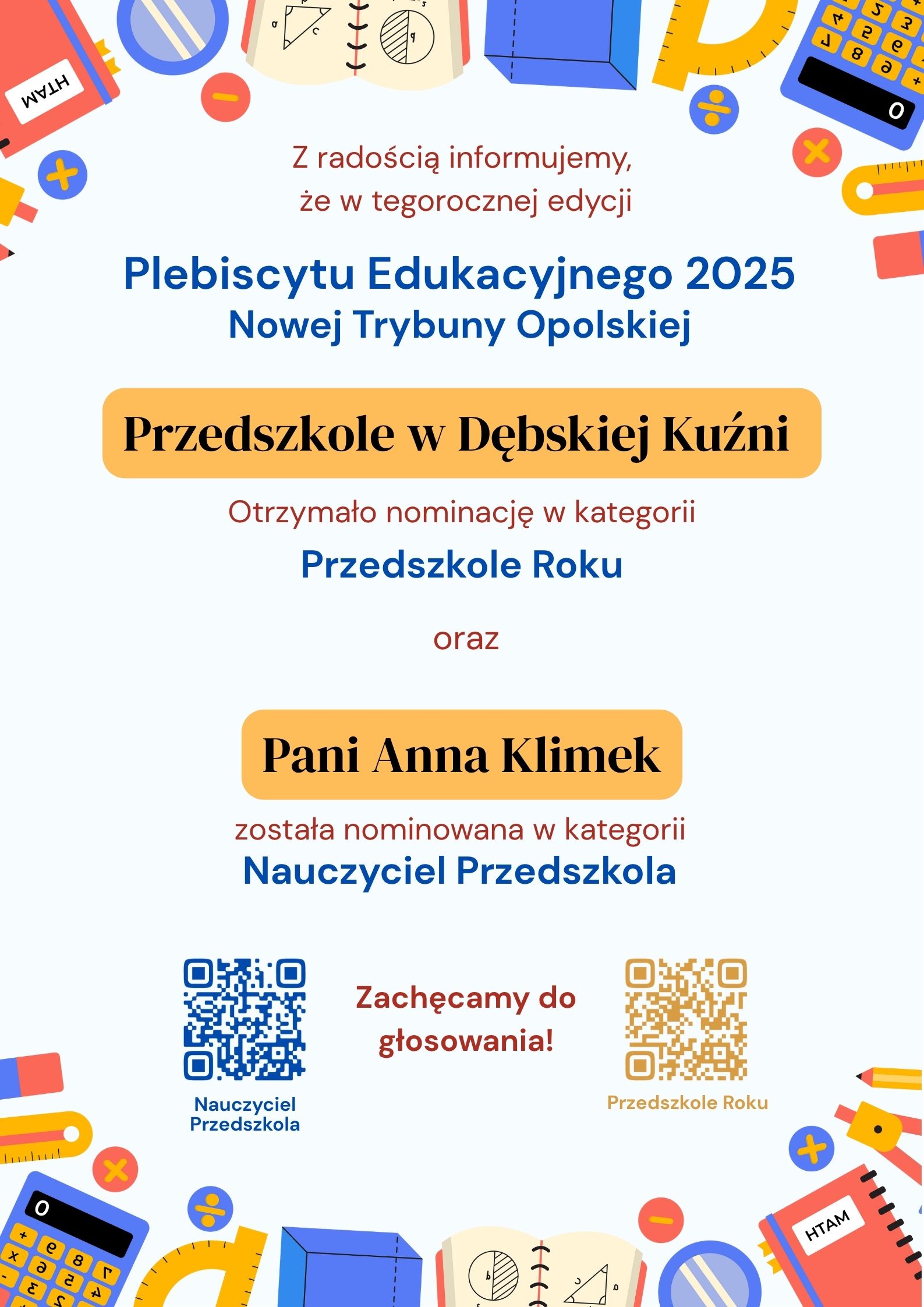 Redakcja Nowej Trybuny Opolskiej poinformawała, że Publiczne Przedszkole w Dębskiej Kuźni otrzymało nominację w kategorii Przedszkole Roku, natomiast Pani Anna Klimek otrzymała nominację w kategorii Nauczyciel Przedszkola. Głosy można oddawać od wtorku 21 października 2025r skanując kody QR z plakatu lub poprzez załączone poniżej linki: