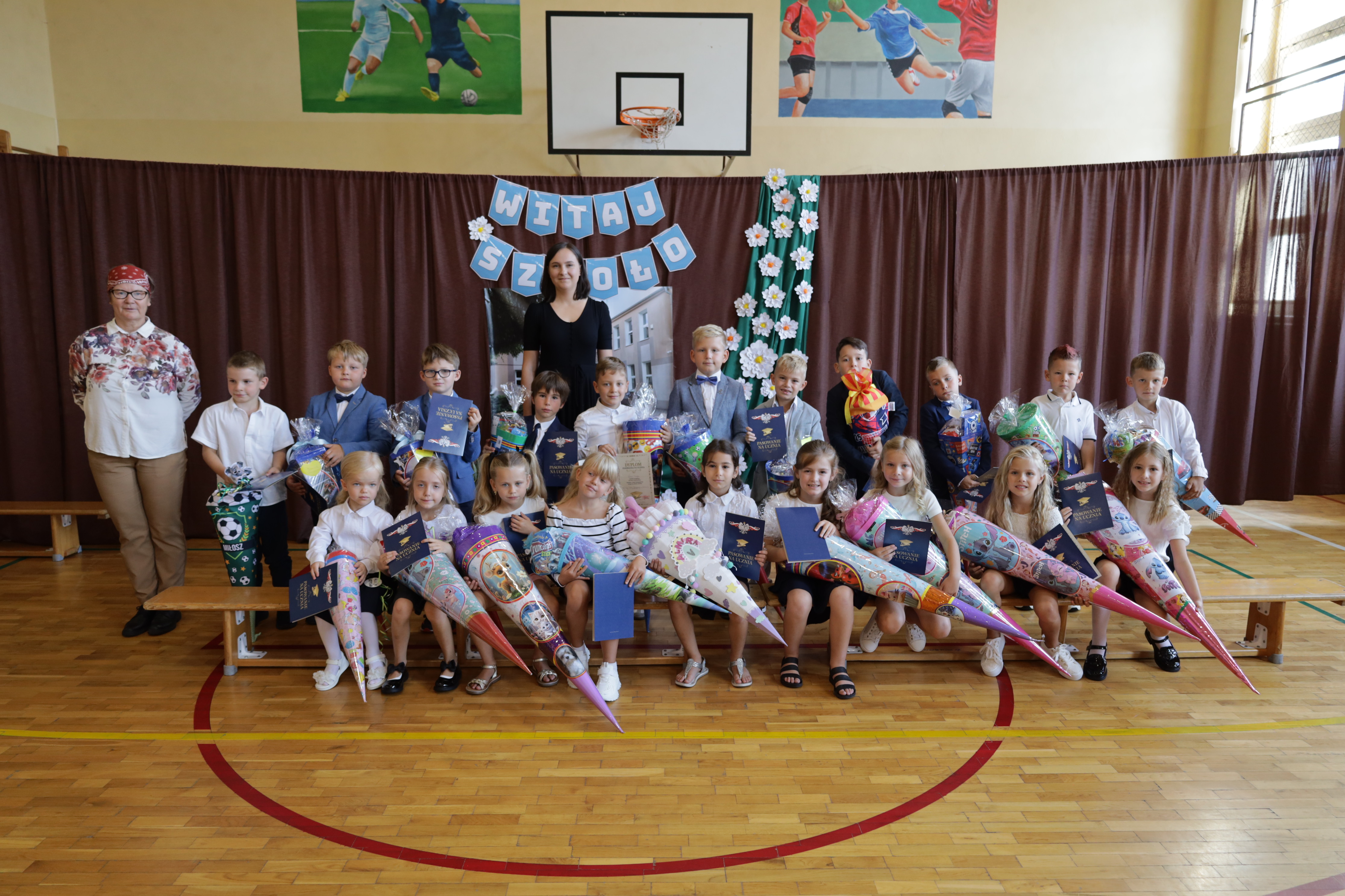 1 września podczas Uroczystego Rozpoczęcia Roku Szkolnego 2025/2026 w naszej szkole Pani Dyrektor serdecznie powitała uczniów, rodziców i nauczycieli. Uczniowie klasy trzeciej przygotowali krótką część artystyczną, w której wierszami przywitali pierwszoklasistów. Po złożeniu ślubowania i pasowaniu na uczniów naszej szkoły pierwszoklasiści otrzymali tradycyjne rogi obfitości wypełnione słodyczami.